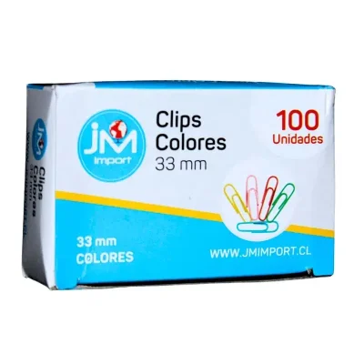 Clips JM 33 mm en colores surtidos. Pack de 100 unidades. Sujetan documentos sin dañarlos. Resistentes, coloridos y perfectos para oficina, colegio o uso diario.